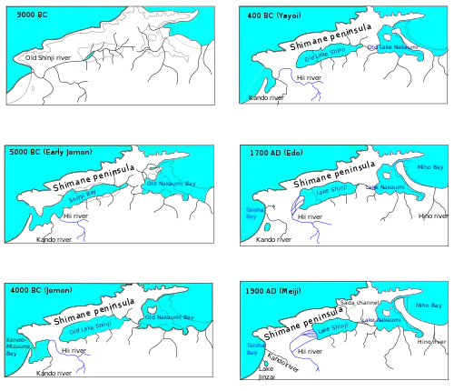 During the Last Glacial Maximum, the Shimane Peninsula was fully connected to Honshu. The Old Shinji river flowed in the place of modern lake Shinji and Izumo Plain. About 9000 BC the sea level began to rise and seawater intruded into the low-lying areas in the east and the west ends, between the hilly peninsula and Chūgoku Mountains. During the temperature peak of the warm Atlantic period (early Jomon) the sea probably separated the peninsula almost entirely from the mainland. At that point the Hii river flowed into the Old Shinji Bay, located at the place of modern lake Shinji and Izumo Plain.[16][17][5][7][18]