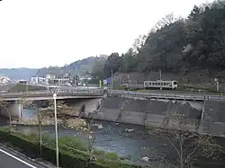 The Hii river is 153 km long and the catchment area is 2540 km2; the population of the catchment is about 500.000.[3] It is 19th longest river in Japan, and 29th largest by its catchment area.[7] It is designated as a Class A river system by the Ministry of Land, Infrastructure, Transport and Tourism (MLIT).[3] The bottom gradient is about 1/160-1/700 in the upper reaches and 1/860-1/1500 in the lower part.[10] The mean annual precipitation is about 2300 mm in the upper reaches[10] and 1700–1845 mm in the lower reaches,[12][13][10] most of it occurring in the southwestern part of the basin.[7] The annual discharge in the midstream (Otsu, Izumo city) is 1.4 bln m3.[7] The main tributaries of Hii are Ai, Ohmaki, Kuno, Mitoya and Akagawa. In addition, rivers Iinashi and Hakuta discharge into lake Nakaumi.[6][7]