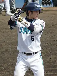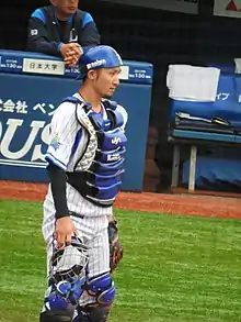 His right arm can throw at a distance of 120 meters, while his 50-meter dash is clocked at 6.0 seconds.[17] Overall, he's a well-rounded player in terms of speed, offense and defense, but his hitting and strikeout rates still have room for improvement.[18] He has a reputation for drawing out the best in pitchers by using their strengths to their advantage.[19]