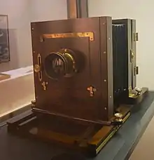 It was only after his contact with Swiss photographer Pierre Rossier (1829 – ca. 1890) that Ueno decided to pursue a career as a photographer. Rossier had been commissioned by the firm Negretti and Zambra to photograph in Asia and he worked in Japan from 1859 to 1860. He was only in Nagasaki for a short time, but while there he taught wet-collodion process photography to Ueno, Horie Kuwajirō (18311866), Maeda Genzō (18311906) and others. Soon after, Ueno's friend Horie bought a wet-plate camera. The purchase, which included photographic chemicals, was funded by the daimyō of Tsu Domain, Tōdō Takayuki, and the price was 150 ryō. Apparently the photographic equipment was of such interest to Ueno that he chose to become a subject of the Tsu Domain in order to have access to it at the domainal residence in Edo.[3] and in 1861 Horie photographed Ueno at work in the domain's laboratory in Edo (now Tokyo).[4] In 1862 Ueno and Horie co-wrote a textbook titled Shamitsu Kyoku Hikkei that comprised translated extracts from ten Dutch science manuals and which included an appendix titled Satsueijutsu [The Technique of Photography] that described techniques of collodion process photography as well as Nicéphore Niépce's asphalt printing method.[lower-alpha 5][4]