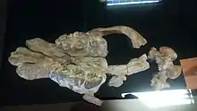The holotype specimen of Hilarcotherium castanedaii is named IGM p881231. This consists of fragments of skull, a partial jaw, the vertebral ramus of a dorsal rib, a complete left humerus and an incisor tooth associated. The skull includes the rostrum area, the palate with the fourth premolar (P4) and the three upper molars (M1-M2-M3) plus part of the zygomatic arch and the braincase, but lacks the upper canines and the top portion of the skull. The premaxilla shows no sign of having teeth, as in other astrapotheres. The jaw missing the incisors, the crown of the fourth premolar and the left mandibular ramus, but has the roots of the teeth of the right side and a broken canine with an oval cross section. It has however the sockets for three incisors on each side of the jaw, which is a plesiomorphic feature, as its other relatives as Xenastrapotherium had two.[1] In 2018, Carillo et al. described a partial skull and mandibule of a second species H. miyou from the Castilletes Formation in the Cocinetas Basin of northern Colombia.[2]