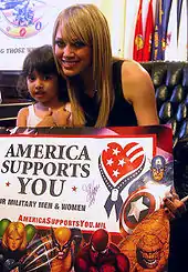 Alongside the release of Dignity and the music videos for "With Love" and "Stranger", Duff began to adapt a more mature image. Duff's new image inspired some to consider her a "sex symbol".[74] This image was reinforced by her appearance in the political satire film War, Inc. (2008), in which Duff portrayed an "oversexed" Central Asian pop star named Yonica Babyyeah. The film received a limited release in the United States.[75] Duff recorded the songs "Boom Boom Bang Bang" and "I Want to Blow You Up" for the film.[75] A re-release of Dignity was initially announced for a 2008 release, but Hollywood Records instead released a greatest hits album.[76][77] Best of Hilary Duff (2008) received little promotion prior to its release, entering the Billboard 200 at number 125.[78] It became her first album released in the United States to not receive a certification from the RIAA.[78] The compilation included the single "Reach Out", which samples the Depeche Mode song "Personal Jesus".[79] The song featured provocative lyrics referencing sex, while its music video similarly saw Duff in a more risqué light.[80][81] The song became her third consecutive single to top the Hot Dance Club Play chart in the United States. She announced to MTV that she would begin writing another album in December 2008, but it was never developed.[82][83] That same year, Duff ceased to have control over Stuff by Hilary Duff, thus the line was discontinued.[84][85]