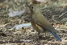 The Himalayan bluetail (Tarsiger rufilatus), also called the Himalayan red-flanked bush-robin or orange-flanked bush-robin,[3] is a small passerine bird that was formerly classed as a member of the thrush family Turdidae, but is now more generally considered to be an Old World flycatcher of Muscicapidae. While currently under review, this taxon is not current recognized as a species by BirdLife international.[4]