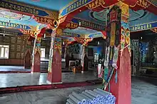 The Gompa[8] is typically located within the monastery complex and is designed to facilitate deep concentration and inner exploration. The space is usually large, with minimal furnishings, and may be decorated with symbolic images and objects that are relevant to the particular practices being undertaken.[9]