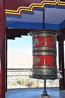 7. Prayer Wheel: A prayer wheel[16] is a cylindrical wheel that is inscribed with mantras or prayers. It is a ritualistic place where devotees spin the wheel in a clockwise direction, believing that each turn of the wheel generates positive energy and blessings.[17]