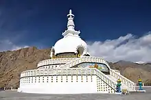 The stupa is also known as the Peace Pagoda. https://en.wikipedia.org/wiki/Shanti_Stupa,_Ladakh References 1. "Buddhist Stupas in South Asia" by Himanshu Prabha Ray, published by Oxford University Press in 2011. 2, "The Shanti Stupa, Leh: A Case of Buddhist Pilgrimage and Tourism" by Rinsol Ganzin, published in the Journal of Heritage Tourism in 2013. 3. "Buddhist Pilgrimage in India: The Ultimate Destination" by Swati Mitra, published by Niyogi Books in 2018, |