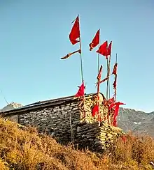 ![]() Aadi Himani Chamunda temple as viewed against the backdrop of the Dhauladhar mountains. This is a makeshift temple after the original temple was burnt by lightning in February 2014 | |