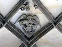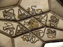 The barrel vault over the cloister with its applied reticulated ribwork comprises seven bays between two corner bays. In fields between the ribs, 26 angels are depicted, 19 of whom play music on various instruments.[21][22] The musical instruments are oriented to the theme of the sandstone reliefs; for example, at the height of the depiction of hell, the bell is struck to chase away evil spirits. The musical instruments depicted, some of which are no longer in use today, are monochord, three-hole pipe with tabor, portative, lute, psaltery, vielle, trumpet, triangle, rattles, shawm, slide trumpet, timpani, bugle, handbell, dulcimer, hurdy-gurdy, harp and bagpipe. An instrument after the angel with the lute is no longer recognizable. As a conclusion, King David is depicted with a crown, opposite him the prophet Isaiah. Their banners reflect the motto of the Angel Concert. Translation: "Praise him with timpani and round dance." (Ps. 140,4) and "Rejoice and sing praises ..." (Is. 12,6) A heavenly choir, which probably, as Meissner assumes, refers to the name of the abbey.