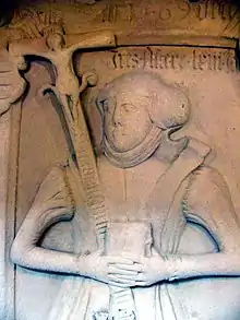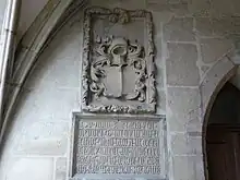 In addition to other epitaphs, especially from the 17th and 18th centuries, including those for teachers and priests, there are surviving grave monuments of the Counts of Orlamünde and also of lesser noble Franconian knights, many of whom were free of riches.[9][16] There are a total of four epitaphs from the burial place of the Counts of Orlamünde. The unknown artist of the elaborate Orlamünde funerary monuments is called Wolfskeelmeister. Several abbesses were buried in the abbey, nine epitaphs of them are placed in the church. There are also other epitaphs under the church floor, of which more detailed descriptions are available.[17] For example, the epitaph of Margarethe von Wiesenthau with the parental coats of arms Wiesenthau and Sparneck serves as the foundation of a column.