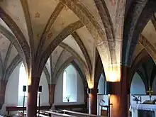 In the chancel, isolated traces give clues to the earlier decoration of the church. The middle choir window has a stained glass from the 14th century. The remnant of a 15th-century wall painting depicts the Veronica's veil. In the early 1990s, restoration work in the floor of the choir found more stone slabs with frescoes, which are exhibited in the Collegiate Church Museum. These include a figural representation that has been fixed to the wall in the cloister for some time. Also from the monastic period are the piscina behind the altar and a crucifix from around 1470.