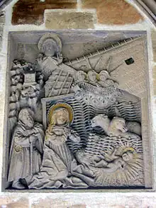 In the western corner yoke of the cloister, a sandstone relief with a coat of arms and a plaque commemorate the construction of the cloister under Elisabeth von Künsberg. In the north wall of the cloister, which is at the same time the outer wall of the collegiate church, seven further reliefs made of sandstone are embedded, which served the nuns for meditation.[18][19] Depicted are core statements of the Christian faith, as they are contained in the Credo (Creed) of all Christian denominations: the Creation myth, the Annunciation to Mary, the Birth of Christ, his Crucifixion, Resurrection and Feast of Ascension. The works were created in 1460-1470 and probably had woodcuts as models, which were only slightly older. There are similar representations in other places. In the eastern corner yoke is the depiction of Jesus as the Man of Sorrows.[20]