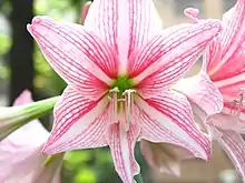 Originally described by L'Héritier as petalis venosis transversal distincta,[4] a reference to the defining characteristic of the species with an unusual and exquisite venation of the petals, darker than the purple to pink background color. The seeds are unusual for Hippeastrum in being orange-red, round, turgid and fleshy rather than black and paper like.[5][6]