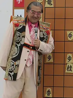 He is known for wearing colorful suits on television programs as a shogi expert.