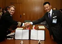 Hiroshi Nakada (right) shakes hands with the commanding officer of NAF Atsugi on April 10, 2009.