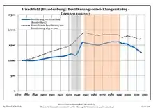 Development of Population since 1875 within the Current Boundaries (Blue Line: Population; Dotted Line: Comparison to Population Development of Brandenburg state; Grey Background: Time of Nazi rule; Red Background: Time of Communist rule)