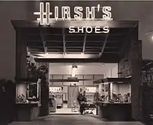 David Hirsh emigrated as a child with his parents from Eastern Europe to Pennsylvania where they owned a successful boot shop. David's wife, Rose, was a first generation Pennsylvania native. Seeking a warmer climate to help with Rose's arthritis, the family relocated to Tucson in 1944. In 1954 architect Bernard Friedman was commissioned by Rose to design a modern building for her new shoe store in the emerging suburban shopping district along Broadway Boulevard near Broadway Village. The Hirsh's Shoes building, although now sandwiched between other buildings, was originally designed as a freestanding structure. As a rare surviving example of the popular open front façade, its interior and exterior zones are fully integrated. The dynamic entrance is topped with the original neon letter forms. For 62 years the Hirsh family has maintained the unique architectural expression, typical of the best mid-century retail storefronts. In 2015 the Hirsh Family was honored with a preservation award from the Tucson-Pima County Historical Commission for their stewardship of Hirsh's Shoes building.[4]