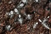 The hairs on the stem are straight and point away from the substrate, emerging from the stems at oblique angles. They are 150 to 250 μm in length; at the base, they are 1.5 to 2.5 μm in width, while at the rounded to club-shaped tips, they are 3 to 4.5 μm in width. The hairs do not branch, have moderately thick walls and are somewhat septate. Individual cells in the hairs measure 10 to 30 μm in length.[5]