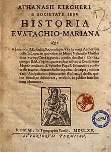 Historia Eustachio Mariana is a 1665 work by the Jesuit scholar Athanasius Kircher. It describes his chance discovery of a ruined shrine of the Virgin Mary at Mentorella, the site where tradition held that the Roman martyr Saint Eustace had experienced conversion to Christianity.[1][2] The book was dedicated to Giovanni Nicola, abbot of the monastery at Vulturalla, and a member of the family of the counts of Poli.[3] It was intended to help raise funds for the restoration of the chapel, and it was Kircher's first topographical work.[4]:20