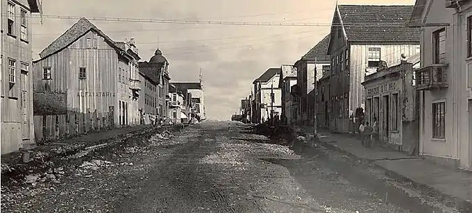 At this time, almost all buildings were made of wood, with few examples in masonry. Even large industrial pavilions were built in wood, with the araucaria being the most used, as it was abundant in the region at the time. The paving of the center would take a long time. Until Colonel José Pena de Moraes took office, the center would have had dirt roads with gravel, and only a few streets with paved sidewalks. The main focus in the first decades was the organization of the Dante Square and Rua Grande, where works for the flattening and lowering of the land began, a process delayed and complicated by the existence of a large quarry in the area.[7][5]