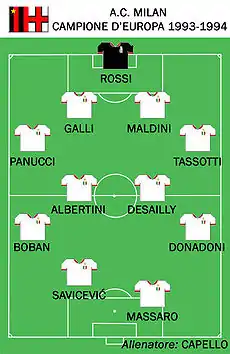 In addition to three consecutive Scudetti from 1992 to 1994, including the feat going undefeated in 1991–92, Milan reached the Champions League final in a record three consecutive years. In 1993 Milan was defeated by Marseille, a result later disputed by a match-fixing scandal in the French Ligue 1 involving Marseille's then-club president Bernard Tapie. In 1994, however, Milan defeated Barcelona after a sensational 4–0 win, while in 1995, Milan fell to Ajax. Then, in 1995–96, led by stars Roberto Baggio, Marco Simone and George Weah, Milan earned its 15th Italian championship. Milan's primary line-up under Capello in that winning season was: Sebastiano Rossi; Christian Panucci, Alessandro Costacurta, Franco Baresi, Paolo Maldini; Roberto Donadoni, Demetrio Albertini, Marcel Desailly; Zvonimir Boban; George Weah, Roberto Baggio.[12]
