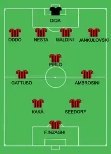 Milan's efforts in the Champions League that year also proved promising, though they ultimately fell short. After coming out on top of their group, Milan advanced to the knockout phase of the tournament, first defeating Bayern Munich on aggregate and then France's Lyon 3–1 on aggregate. In the semi-finals, they were eliminated by eventual champions Barcelona 0–1 on aggregate, where Milan striker Andriy Shevchenko had a goal controversially disallowed.