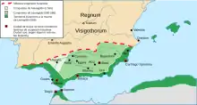 From 531 the Visigothic king Teudis carried out a rapid expansion towards the south, installing his court in Seville, in order to have a better control of his operations in the south of the peninsula. He even led an unsuccessful offensive against the Byzantine power established in Settem (Ceuta). The Baetica was definitively integrated in the Visigothic kingdom of Toledo, although when the interests of the Hispanic-Roman landed oligarchy were in danger, rebellions, such as those of Athanagild and Hermenegild, took place.[18]