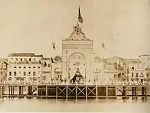 In 1866, the Amazon, Tocantins, Tapajós, Madeira, and Negro rivers were opened to navigation by merchant ships of all nations, contributing to the development of the capital of Pará.[9] To consolidate this act and establish the imperial presence in the north after Cabanagem, it was announced that Pedro II would come to the city to officially announce the opening of the Amazon River.[44] Thus, a Triumphal Arch was built by the Companhia do Amazonas to receive the emperor.[44] But the Arch was not preserved, as it was a scenographic feature of the Companhia do Amazonas and not an actual architectural building.[44] In this period photography began to have a greater presence and diffusion in Belém with the contribution of the Portuguese photographer Filipe Fidanza and with the arrival of Emperor Pedro II in 1867, an encourager of this art.[44]