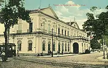 In this period, major buildings and infrastructure works were erected in the city. In 1869, Calandrine de Chermont began the construction of Theatro da Paz (1874), with the influence of neoclassical architecture and inaugurated in 1878 during the government of João Capistrano Bandeira de Melo Filho.[50] It is considered one of the most luxurious theaters in Brazil and one of the country's monumental theaters.[50] Other examples are the Olympia Cinema - the oldest in Brazil in operation - one of the most luxurious and modern of the time (opened in April 1912);[47][48] the Ver-o-peso, the largest market in Latin America;[51][52][53][54] and the Batista Campos Square.[48][55] In 1868, the construction of the Antônio Lemos Palace (1873) began, to be the Municipal Palace, being inaugurated in 1883 during the government of Rufino Enéas Gustavo Galvão.[48] Thus, these works attracted waves of foreign immigrants, such as Portuguese, French, Japanese, Spanish, and other smaller groups.[45]