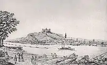 In 1775, Coronation Hill was built by Maria Theresa from soil of Hungary's 64 counties. The new monarch had to ride to the crowning hill and swish their blade towards the four cardinal points.[22] However, in 1783, under the reign of Joseph II, the Crown Jewels were taken to Vienna, and many central offices moved to Buda, which were followed by a big part of the nobility.[23][24] From here on Pressburg was only the coronation town and the seat of the Hungarian diet. The population decreased and the economic situation of the town deteriorated until 1811.