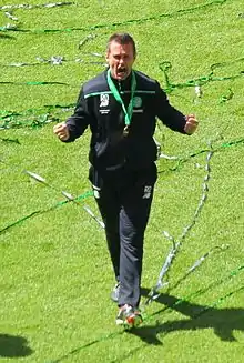 Tony Mowbray was announced as the replacement for Strachan on 16 June 2009.[189] He moved from his managerial post at West Bromwich Albion. It was a return to Celtic for the Englishman after playing there for four years between 1991 and 1995 and is considered to be the player who started the famous Celtic prematch "Huddle".[189] He promised a "Barcelona-esque" style of football, and more attacking play,[190] never afraid to hide his admiration for the likes of Arsenal manager Arsène Wenger.[191][192] Things started well, he won his first trophy shortly after signing for Celtic, with victory in the Wembley Cup.[193] He brought Marc-Antoine Fortuné, Landry N'Guémo and Danny Fox to the club.[194]