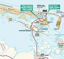 Chincoteague is the name of a town, and the barrier island on which it is located, on Virginia's Eastern Shore, in the United States.[1] The island is about 8 miles (13 km) long and 2 miles (3.2 km) wide. Sand forms its soil, with a thin layer of loam above it away from the water, enough to support pine trees and grass.[2] Chincoteague Inlet, a break in the barrier island system, occurs near Chincoteague Island, at the southern end of Assateague Island. Assateague shelters Chincoteague from the Atlantic and stretches north almost 30 mi (48 km) to Ocean City, Maryland.[1]