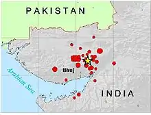 Aftershocks, 2001 Gujarat earthquake – yellow star marks epicenter