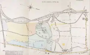 Just to the south of Harringay's present-day borders, a large mansion, Northumberland House, was built by 1824[30] just to the south of the New River on the east side of Green Lanes. The building, which was converted for use as a lunatic asylum as in 1826,[31] remained until the late 1950s when it was demolished and a council housing estate built on the site.