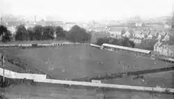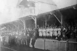 Feeling confident of promotion from the new division, Luton finished ninth in 1920–21 and enjoyed a good cup run. 17,754 fans saw the FA Cup defeat by Preston North End, setting a club attendance record in doing so. Simms scored 34 goals during the season to top-score for the club. Such was the quality of Luton's squad that three Luton players played in a single international at Windsor Park on 22 October 1922 – Louis Bookman and Allan Mathieson for Ireland, and Ernie Simms for England.[12] Despite Luton's playing resources, the side disappointingly finished only fourth. The main stand was destroyed in a fire and rebuilt before the start of the 1922–23. As the club finished fifth, seventh and then 17th, hopes of quick promotion disappeared.[13]