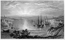 By the late 18th century, the two creeks which would delimit the future town of Milford's boundaries to the east and west, namely Hakin and Castle Pill, were being used as harbours for ships to load and unload coal, corn and limestone.[22] A ferry service to Ireland operated from Hakin around the start of the 20th century, although this ceased in the early 19th century.[23] Although surrounding settlements at Steynton, Thornton, Priory, Liddeston and Hubberston/Hakin were established, they were little more than hamlets. The only man-made structures on the future site of Milford were the medieval chapel, and Summer Hill Farm, and its accompanying cottages.[23]