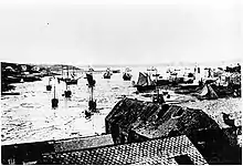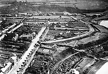 By 1901, the town's population had reached 5,102, and by 1931 had doubled to 10,104.[44] During World War I, the Haven was an assembly point for convoys to Gibraltar, and a base, under the command of R.N.R. Captain (and retired Admiral) Charles Holcombe Dare, to counter the activity of German U-boats off the coast of Pembrokeshire.[45] The town welcomed many Belgian refugees from Ostend, many of whom had known the area through landing fish;[41] they bolstered the fishing fleet, depleted by war service, and later erected a memorial in gratitude.[46] The early 20th century saw a period of increased urbanization of the area. The land immediately back from Hamilton Terrace, bounded by Robert St, Priory Road and Great North Road was now completely built upon. In the period from the First World War to 1937, 312 council houses were built in a variety of locations, including estates at Hakinville, Prioryville, Glebelands and Prescelly Place. In 1926 the Urban District Council completed work on an electricity plant, thereby completing the electrification of the town, at a cost of £70,000.[23] A sewerage plant followed in 1930, the Prescelly Waterworks in 1932, and in the same year the original toll bridge linking Milford and Hakin was replaced with Victoria Bridge. The steep gradient of the Rath was at this time constructed, and in 1939 Milford Haven Town Hall was opened on Hamilton Terrace, at that time possessing an inbuilt fire station. 1939 also saw the opening of an outdoor swimming pool on the Rath.[23] During the Second World War Milford Haven was chosen as a base for allied American troops, and roughly 1,000 American military personnel were housed in the town at this time. They manned an amphibious base which included a hospital built in Hakin and a docks complex at Newton Noyes. The base, initially commanded by Rear Admiral P. E. Phillips and from 1942 by Vice-Admiral Fairbairn, had a complement of 71 officers and 902 enlisted men, and played a role in preparations for D-Day.[47] A focus of activity for the base included mine sweeping of the Haven, which was subject to aircraft attack on 50 occasions. Milford town escaped serious damage from German bombings during the Second World War however, and bombs were seldom dropped on land. Despite its strategic importance as the home of a large fish market, a mines depot, a flax factory, and housing numerous military personnel, a co-ordinated attack on the town never materialised. In the summer of 1941 a bomb fell in fields near Priory Road, and later that year, a bomb damaged a house in Brooke Avenue. In neither instance were there casualties.[48] August 1941 saw the Meades Farm hit in an unsuccessful attack on Air Ministry underground petroleum tanks in Priory Pill, which resulted in non fatal injuries. Due to it strategic importance as a naval base, few children were evacuated from urban centres to Milford Haven. Requisition of the fishing fleet in August 1939 for naval duty meant that the number of trawlers in Milford dropped from 109 in July 1939 to 51 in December of that year.[23]