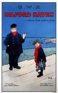 The town's population was further boosted by Quaker whalers from Nantucket, and a growing fishing industry that employed a large number of people. By 1849, the district of Hakin was described as a considerable centre of boat building, with approximately 200 "shipwrights residing at that place".[35] The Milford Docks Act 1874 authorised the construction of a docks in Hubberston Pill, a plan which was estimated to require two and a half years before completion. Actual completion was not achieved until 1888, delayed in part due to the bankruptcy of Samuel Lake.[6] Contemporary speculation suggested that a journey between London and New York via Milford would now be possible in less than seven days, two days fewer than the voyage on the established Liverpool route.[36] There was also considerable thought given to a proposed "Montreal & Milford Line", linking the two ports and potentially cutting the journey time even further than that of New York.[37] It was eventually finished in 1888, but the transatlantic trade hoped for never materialized.[13] Instead, the newly completed dockyard became the home of a sprawling fishing industry. By 1906, Milford had become the sixth largest fishing port in the UK, and in contrast to the general decline in Pembrokeshire's economy and a migration towards the South Wales Coal fields during the 1880s, its population rose. The Pembrokeshire Herald claimed in 1912 that "the fish trade is Milford's sole industry....the population of the town has doubled by means of it".[38] In 1863, the railway network came to Milford, linking it to the Haverfordwest line and beyond. In 1866, work was completed on an additional extension which provided access to the docks and mining depot on the eastern side of the town.[39] If the Manchester and Milford Railway scheme had come to fruition, the town would have enjoyed a direct rail link to the Midlands and Northwest England.