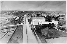 There had been a Quaker population in Pembrokeshire since 1650, although its numbers had been in decline following emigration to North America. Greville, supported by Sir William Harcourt, proceeded to invite seven Nantucket Quaker families to settle in the new town, and in 1792 they arrived, led by the Starbuck family, with the intention of developing a whaling fleet to service the growing demand for street lighting.[26][27] Greville had highlighted the opportunities for trade with the Americas from the town to the New Englanders, and lobbied the Board of Trade to support the plan.[26] A lack of suitable accommodation in the town encouraged building of residential properties on undeveloped land above the harbour, which had been organised into three long streets, terraced back one from the other, with intersecting side streets. The Front Street housed austere homes for the Quakers, which allowed them to look out to sea in keeping with the Nantucket style. The Middle Street became the commercial centre, and the back street housed artisans.[23] The frequent claim that an American gridiron pattern was used may not have been as integral to the design as the fact that the topography of the landscape required it, the steep gradient preventing other designs.[23] Several important Quaker families established large homes during this time, including Samuel Starbuck Sr at Priory Lodge and Uriah Bunker at Bunkers Hill, and by 1810 the town could boast 150 houses, businesses and a hotel.[26] In 1797 the Navy Board established a dockyard which produced warships. Seven royal vessels were eventually launched from the dockyard, including HMS Surprise and HMS Milford.[28] Progress was rapid, and by 1802, Admiral Horatio Nelson had been invited to view the town in person as part of a tour to celebrate the anniversary of the Battle of the Nile. He spoke glowingly during a banquet held in his honour, commenting on the number of whaleships sent to the Southern Oceans, Milford's status as a primary seaport on the west coast of Britain, and culminated in comparing the harbour with that of Trincomalee in Sri Lanka as to be the two best he had ever seen.[23] Greville's plans were no less ambitious. At a site on high ground in Hakin, he planned to build "The College of King George the Third founded at Milford", whose centrepiece would be an observatory. Although the observatory was built, and indeed scientific instruments were delivered, the college never functioned as such.[23] A church, dedicated to St Catherine of Alexandria, was consecrated in October 1808. Located in the underdeveloped eastern side of the town, it remained a chapel of ease until 1891 when Milford became a parish, until that time competing with St Peter and St Cewydd in Steynton.[23] By around the start of the 19th century, a mail coach was operating between London and Hubberston, arriving in the evening and returning the following day, connecting with the packet service to Ireland.[29] In 1800 the short-lived Milford and Pembrokeshire Bank was established by Thomas Phillips, operating from a branch in the town. It collapsed in 1810.[30]