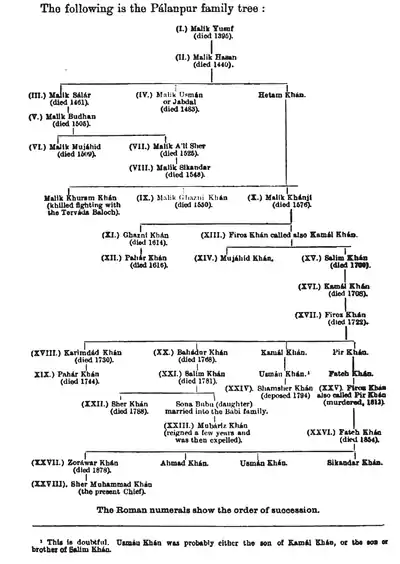 According to tradition the dynasty ruling the Palanpur state was founded in 1373 and was ruled by the Jhalori dynasty of Lohani (Bihari, Pathan) Pashtun tribe. While the earlier history of the family is who established themselves in Bihar during the twelfth century and ruled there as governors, Suba. Malik Yusuf, the founder of the Palanpur house, left Bihar in 1370 and entered the service of Vishaldev of Mandore. Appointed Governor of Songad or Jhalor, he took control of that place in the confusion that followed the death of the Mandore ruler in 1373. He possibly has taken control from Viramdev, son of Vishaldev, or from Popanbai, the widow of Vishaldev. He was reputed to have wed the foster-sister of the Mughal emperor Akbar and received Palanpur and surrounding areas as dowry.[2]