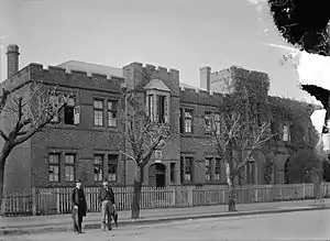 In 1911, the University of Western Australia became Perth's first university, but it was not until 1913 that tuition began.[18] The original campus was located in Irwin Street, between Hay Street and St Georges Terrace.