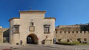 In 1195, following the Battle of Alarcos, Plasencia was recaptured by the Almohad Caliphate. According to some, Ibne Iúçufe, Yaqub al-Mansur's military chief, commanded the capture of the city; according to others, it was taken by al-Mansur himself,[4] and returned to the possession of Alfonso VIII of Castile a year or two later. To ensure defense, the king ordered the walls to be completed, which would not be done until 1201. The walls were built as a double defense system, with a thick wall and a barbican, having a moat between them. The defense was reinforced by the presence of 70 semicircular turrets, 4 defensive towers leaning against the alcazar, seven main gates, and two wickets (minor gates).[3][4]