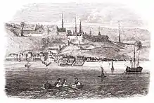 Quebec remained an outpost until well into the 1650s.[14] As in other locations throughout New France, the population could be split into the colonial elites, including clergy and government officials, the craftsmen and artisans, and the engagés (indentured servants).[15] Quebec was designed so that the inhabitants of better quality lived in the upper city, closer to the centres of power such as the government and Jesuit college, whereas the lower town was primarily populated by merchants, sailors and artisans.[15] The city contained only about thirty homes in 1650, and one hundred by 1663, for a population of over 500.[16]
