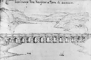The importance of Sacavém and its river can already be appreciated at this time; in fact, the Romans would have built a bridge over the Trancão River, which would still exist in the 17th century, according to several stories —especially those of Francisco de Holanda (who alludes to it in his work Da Fábrica que Falece à Cidade de Lisboa, of 1571, in which he points out the need of the king —at the time D. Sebastian— to proceed with the reconstruction of the bridge, making a sketch of it in which it is represented by 15 arches, so historians assume that the flow of the river was greater in antiquity[5]) and Miguel Leitão de Andrada (in the "2nd Dialogue" of his Miscelânea, dated 1629). This bridge (currently the central element of the town's coat of arms) was the natural continuation of the route followed by the aforementioned roads, linking Sacavém to the north bank of its river.