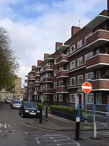 Hornsey as a whole was heavily bombed during the Second World War, when over 80 per cent of the houses suffered damage. Hornsey Council's first major post-war rebuilding was at Stroud Green, where most of the land between Victoria Road, Stroud Green Road, and Lorne Road and Upper Tollington Park was cleared. Facing the main road Wall Court, a balconied block much admired when new, was completed in 1947, Lawson, Wiltshire, and Marquis courts and Brackenbury were built in Osborne Road in 1948, and flats in Nichols Close between 1948 and 1952. Wisbech and Fenstanton date from 1953, the flats and shops of Charter Court from 1954, and Hutton Court from 1960. In 1948 Ronaldshay and Wallace Lodge, on opposite corners of Florence and Wallace roads, and Ednam House facing them were built and in 1952 an extension to Ronaldshay was finished. Carlton Court, 64 flats in Carlton Road, dates from 1947. On opposite corners of Oakfield and Connaught roads Connaught Lodge and Churchill Court were completed in 1949 and on the corner of Oakfield and Stapleton Hall roads Norman Court was completed in 1947. The cul-de-sac Osborne Grove was replaced by an old people's home by 1973. In 1974 Ennis and Woodstock roads were reprieved from demolition and in 1976 several yellow-brick terraced houses were being renovated.[13]