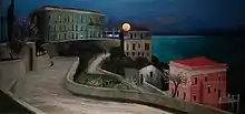 In 1905, the English artist Robert Hawthorn Kitson, heir to Kitson and Company but driven from Britain by homophobia, built a house in Taormina.[35] He commissioned Frank Brangwyn to design murals and furniture for the Casa Cuseni. Alfred East also contributed.[36] In 1907, the English architect C. R. Ashbee, a prime mover of the Arts and Crafts movement, came to Taormina on commission from an old client. Colonel Shaw-Hellier set him the task of designing the Villa San Giorgio,[37][38] Biographer Fiona MacCarthy judges it "the most impressive of Ashbee's remaining buildings";[39] it is run as the Hotel Ashbee. In 1911 Alexander Hood, 5th Duke of Bronté began building a house, La Falconara, on his grandmother's land.[20] Alex Hood was, like his father, a discreet courtier, and unlike his father, discreetly homosexual as well. With his close friend and frequent guest the writer Robert Hichens (best known for The Green Carnation (1894), a satire of Hichens's friends Wilde and Bosie), Hood helped to further establish Taormina (like Capri) as a "holiday resort for wealthy homosexuals from Northern Europe", as historian Lucy Riall put it.[40] One such escapee, Albert Stopford, the art dealer and confidant to royalty, cultivated roses in his Edwardian garden.