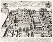 Bathurst's plan, executed over some thirty years, involved the regeneration of a number of Trinity's buildings, including the early fifteenth century chapel (which was rapidly becoming structurally unsound), and the Old Bursary, which became a common room.[7] The old kitchen was similarly replaced in 1681, and the President's lodgings refurbished.[9] The chapel, consecrated in April 1694 and requiring two loans to complete, is the only collegiate building to appear on the itinerary of Peter the Great during his trip to Oxford, though it is unclear whether he set foot inside it. Also constructed was a separate building, designed, like the final flourish of the chapel's design, by Sir Christopher Wren and forming the northern side of what is now the college's "Garden" quadrangle.[7][9] Having raised funds from Trinity's alumni and fellows to settle the £1,500 construction costs, the new block was ready for use by 1668, though the room interior fittings were added gradually by their occupants.[9] Bathurst's continuing desire for expansion precipitated in the creation from 1682–84 of an identical block, which now forms the western side of the Garden quadrangle,[7] as well as an eponymous "Bathurst building", pulled down in the late nineteenth century.[9]