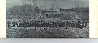 Trumbull National Guard Unit Co. C 8th Regt. CNG, Capt. Charles E. Plumb Commanding, c. 1867. Gristmill in background built by Gideon and Ephraim Hawley c. 1722 White Plains, Trumbull