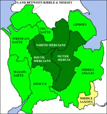 After the Romans left Britain in the 5th century, the Warwickshire area was settled by Anglo Saxon tribes becoming a part of the kingdom of Mercia. While its earliest boundaries will never be known, there is general agreement that the territory that was called "the first of the Mercians" in the Tribal Hidage covered much of south Derbyshire, Leicestershire, Nottinghamshire, Staffordshire and Northern Warwickshire.[18][19][20]