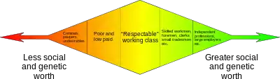 Francis Galton explained during a lecture in 1901 the groupings which are shown in the opening figure and indicated the proportion of society falling into each group, along with their perceived genetic worth. Galton suggested that negative eugenics (i.e. an attempt to prevent them from bearing offspring) should be applied only to those in the lowest social group (the "Undesirables"), while positive eugenics applied to the higher classes. However, he appreciated the worth of the higher working classes to society and industry.