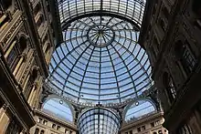 Elaborate covered shopping arcades, such as the Galleria Vittorio Emanuele II in Milan and the Galleria Umberto I in Naples, included large glazed domes at their cross intersections.[43] [44] The dome of the Galleria Vittorio Emanuele II (1863–1867) rises to 145 feet above the ground and has the same span as the dome of St. Peter's Basilica, with sixteen iron ribs over an octagonal space at the intersection of two covered streets. It is named after the first king of a united Italy.[44]